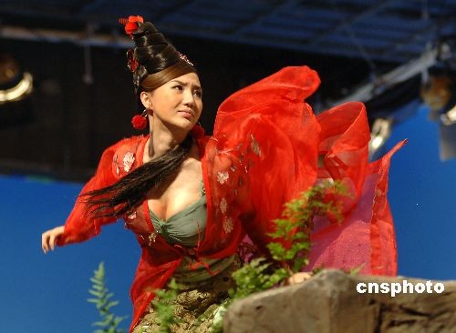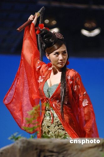 图为阿朵“爆乳”持鞭,古装性感造型亮相。中新社发 李学仕 摄