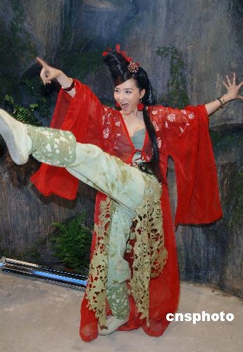 5月27日,李湘王岳伦夫妇联手打造的第二部古装喜剧电影《熊猫大侠》在北京开放杀青戏的媒体探班,并举行首次媒体见面会。现场,歌坛小天后阿朵“爆乳”拍摄了其首次触电的戏份,化身功夫女郎,媒体群访中还大玩“劈腿”展示其童子功。而王岳伦也大赞阿朵的表演很惊艳。而该片总制片人李湘由于正在长沙保胎未能现身。这部古装搞笑剧将于今年10月全国上映。图为阿朵在杀青戏拍摄中“爆乳”卖力表演。 中新社发 李学仕 摄