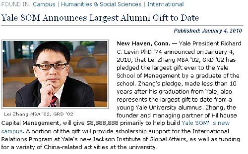 报道说,张磊是Hillhouse Capital Management(高瓴资本管理有限公司)创建人,这笔捐款将主要用于耶鲁管理学院新校区的建设。另外一部分作为奖学金,提供给“杰克逊全球事务学院”国际关系计划项目,以及资助耶鲁各种和中国有关的活动。